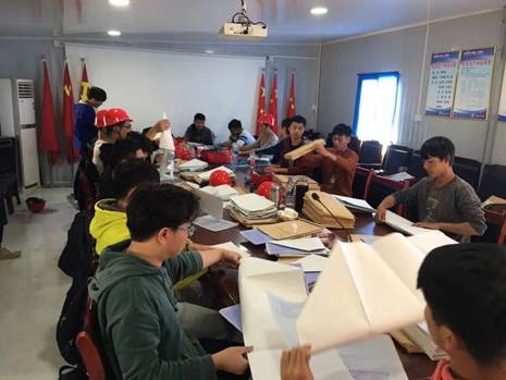 部分实习师生合影 员工现场看图纸、整理资料