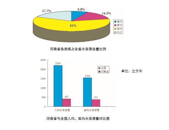 据2008年编制完成的《河南省水资源评价》(水文系列1956-2000年)成果,全省多年平均水资源总量为403.53 亿立方米,其中地表水资源量为302.66亿立方米,地下水资源量为196.00 亿立方米,地表水与地下水重复计算量 95.13 亿立方米。河南 省海河、黄河、淮河、长江流域水资源量分别为27.62亿立方米、58.54亿立方米、 246.08 亿立方米、71.29 亿立方米,分别占全省总量的 6.8%、14.5%、61% 和 17.7%。 全省水资源可利用总量为 195.24 亿立方米,其中地表水为 121.73 亿立方米,地下水为 99.35 亿立方米,重复计算量 26.04 亿立方米。在水资源开发利用方面,全省兴建了包括水库、引水闸渠、提水泵站、机电井等大批供水工程,截至2011年现状年全省供水能力达到 245 亿立方米。