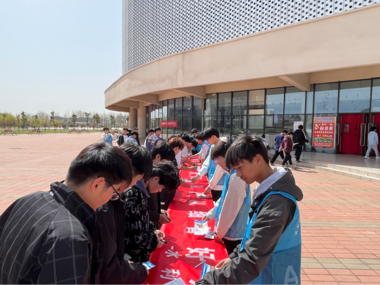 活动正值“中国水周”期间,同学们在湖光苑餐厅门口打起了“精打细算用好水资源 从严从细管好水资源”条幅,发放宣传单页,讲解节水知识和水资源短缺现实,普及节约用水常识和方法技巧,强调节水行动的紧迫性。活动还进行了现场签名,同学们通过签名立下承诺,表达自己节水护水的决心。
